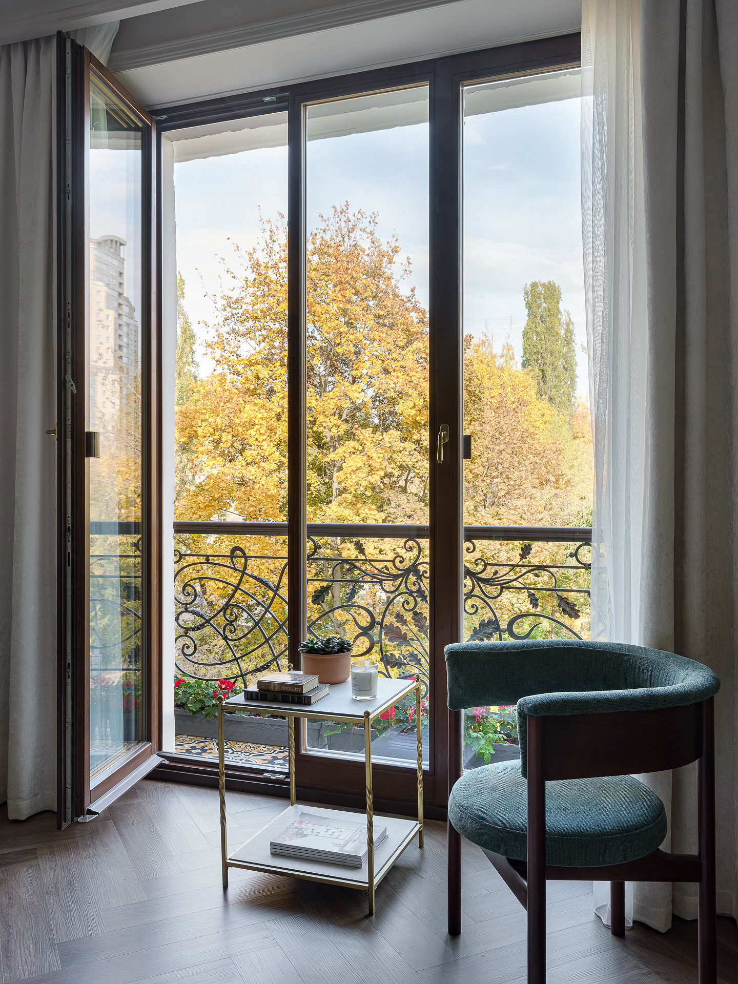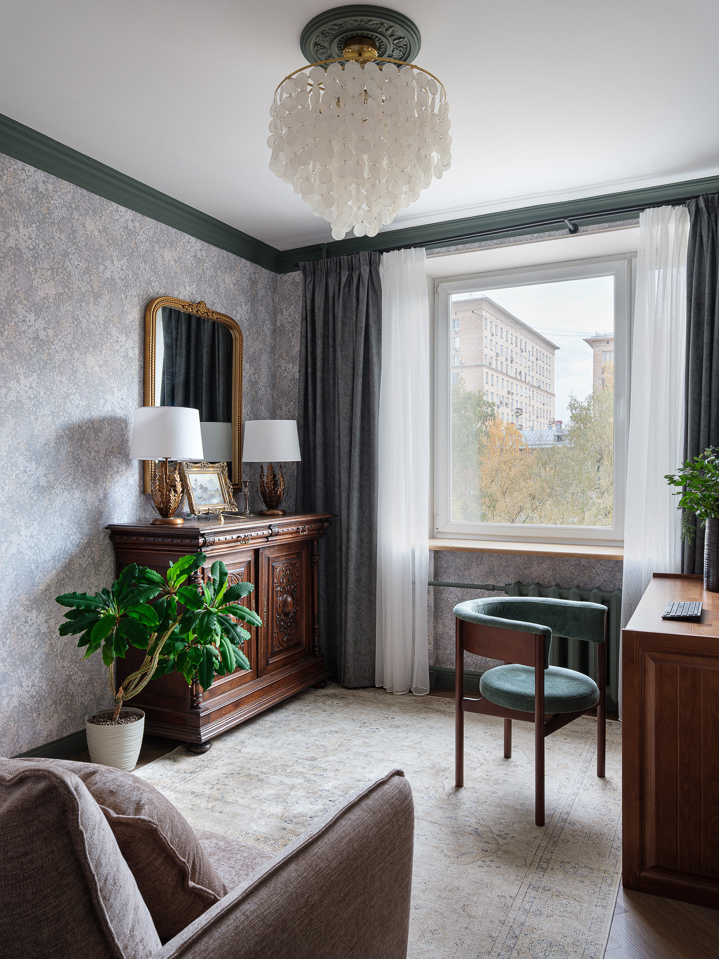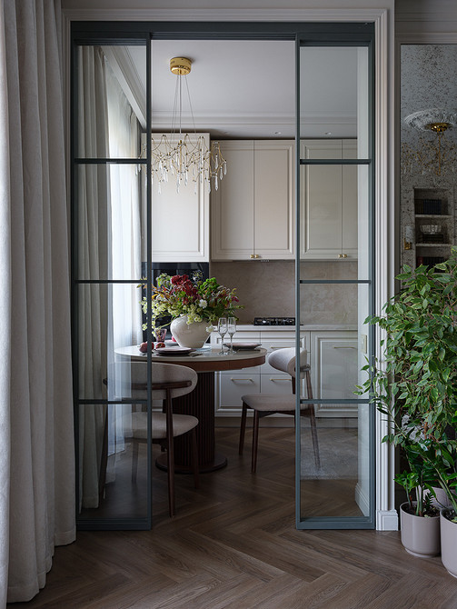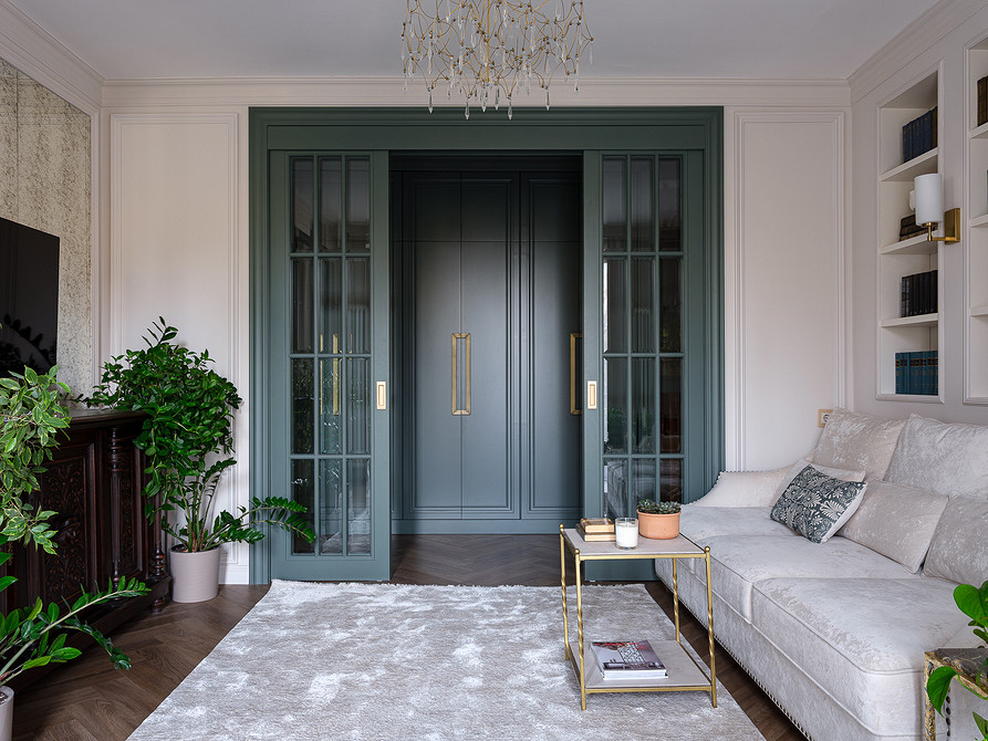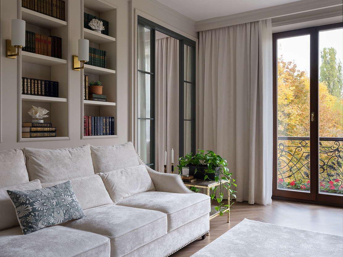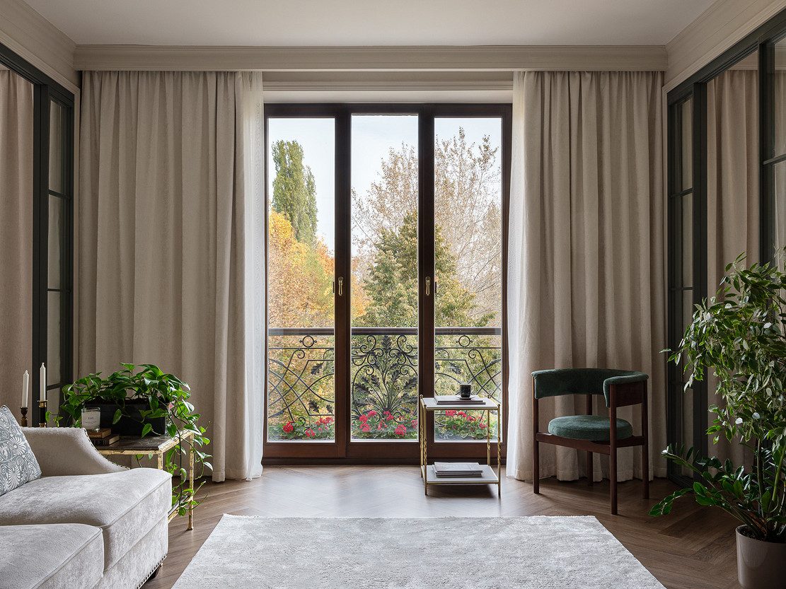 Владельцы этой квартиры в доме сталинской эпохи — дизайнер Светлана Тёпфер и ее супруг. Задача, которую Светлана ставила перед собой при оформлении жилья — сделать из старой квартиры интерьер, наполненный историей и современным комфортом. А также привнести в пространство ощущение природы, которая открывается за окнами. И у нее отлично получилось.