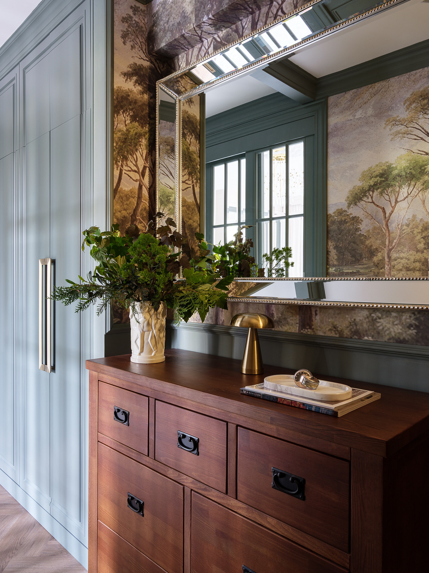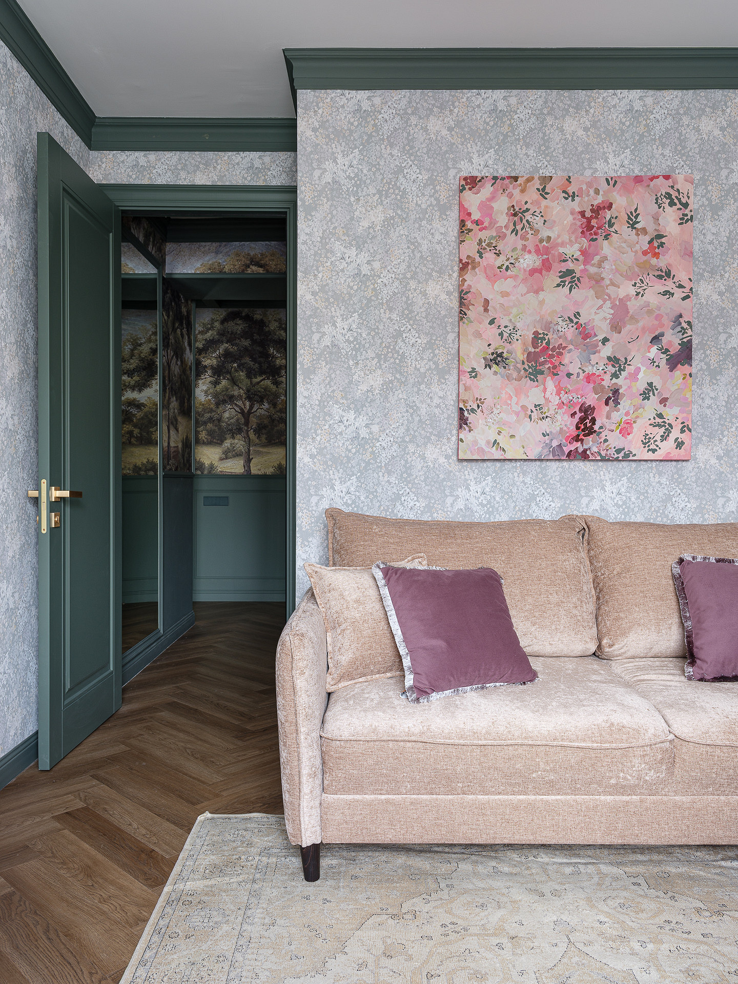 Основная отделка стен — краска. Однако дизайнер использовала и обои для создания атмосферы. Так, в прихожей и коридоре верхняя часть стен украшена обоями с изображением леса. Нижняя часть окрашена зеленой краской и оформлена молдингами так, что получилась имитация настенных панелей.