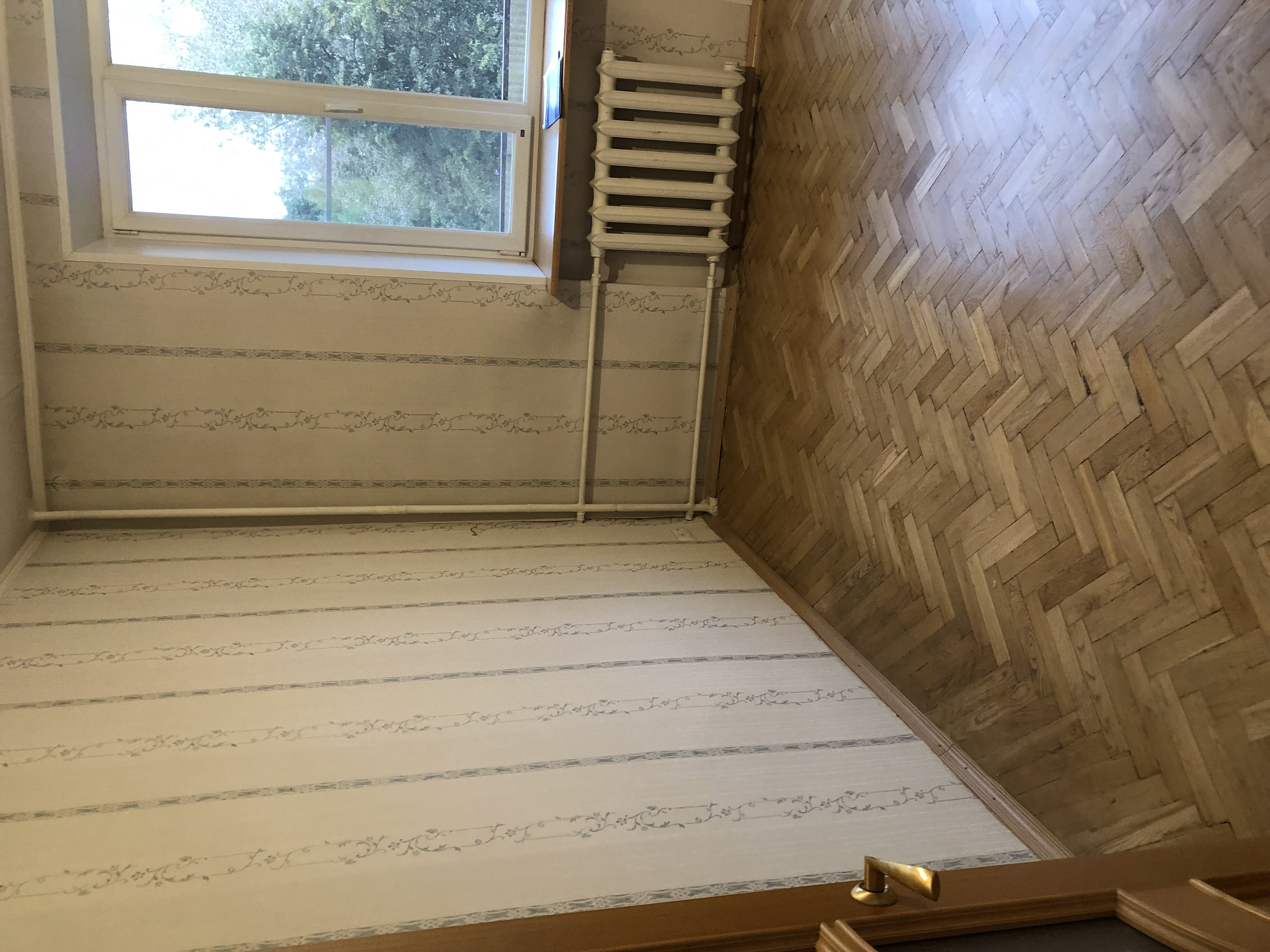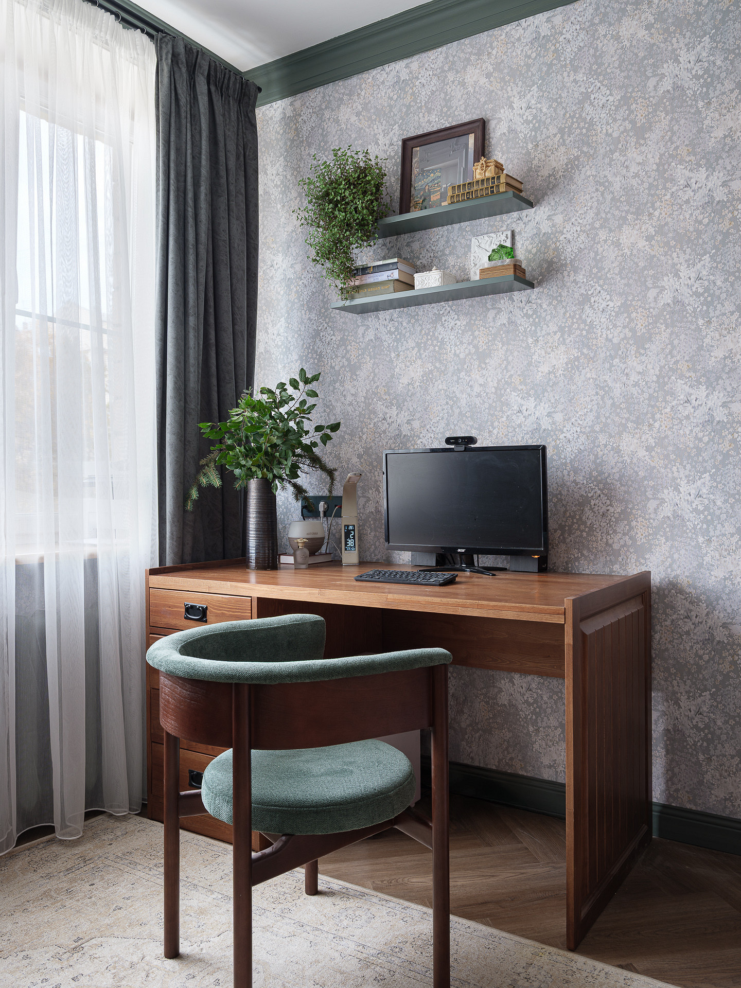 Обои также использовали в кабинете — выбрали мелкий цветочный рисунок.