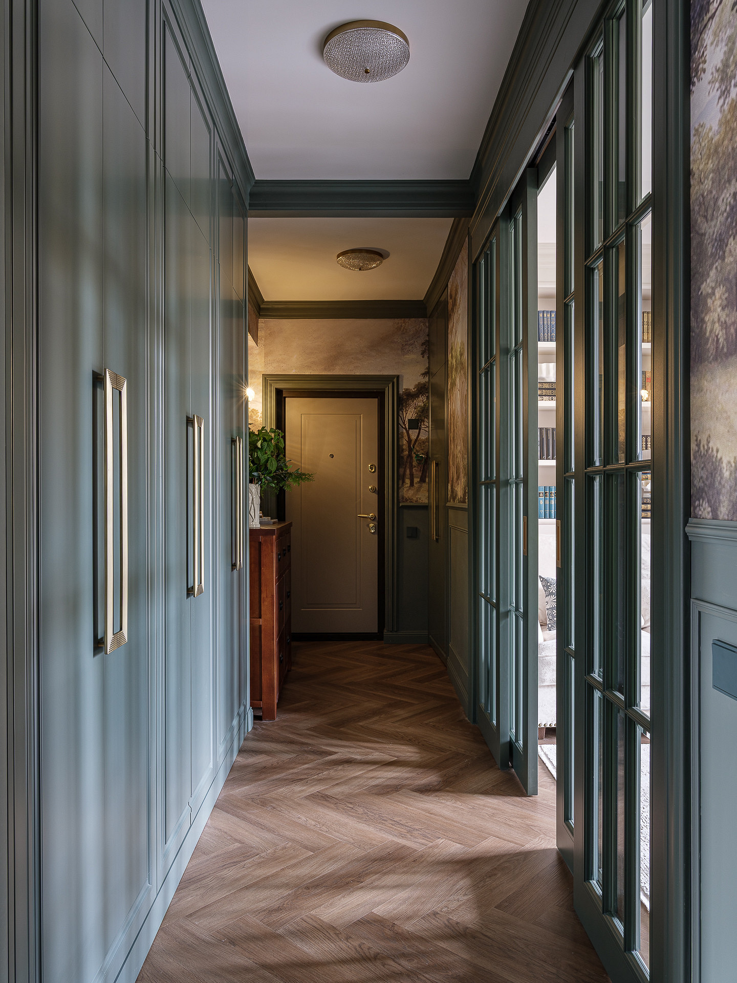 В квартире продумали разные системы хранения. В прихожей — вместительный встроенный шкаф в цвет зеленых стен.