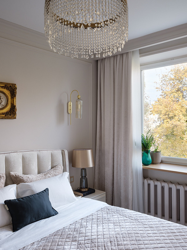 Светлана использовала и современные по дизайну светильники — такие как встроенные «точки» на потолке, и более классические модели: например, люстры в гостиной и на кухне, в спальне и кабинете, настольные лампы и бра.
