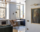 Высокие потолки позволили использовать подвесные люстры. Так и сделали в спальнях и гостиной, прихожей. Но, конечно, потолочными светильниками не ограничились. Есть и бра, и настольные лампы, которые позволяют создать уютную камерную обстановку. Более того, классические светильники скомбинированы с современными по стилю. Так, например, в гостиной потолочная люстра с лампочками-«свечками» соседствует с точечными спотами на потолке и лаконичными бра в зоне кухни.