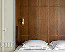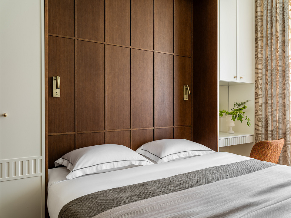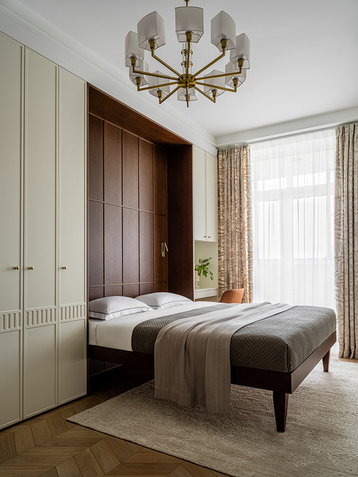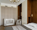 В спальне акцентами стали деревянные панели, которые расположены в нишах, где стоят кровать и кресло. Остальные стены закрыты шкафами, и напротив окна сделали «мягкую» стену с панелями — там предполагалось место для кушетки, а пока его занимает детская кроватка.