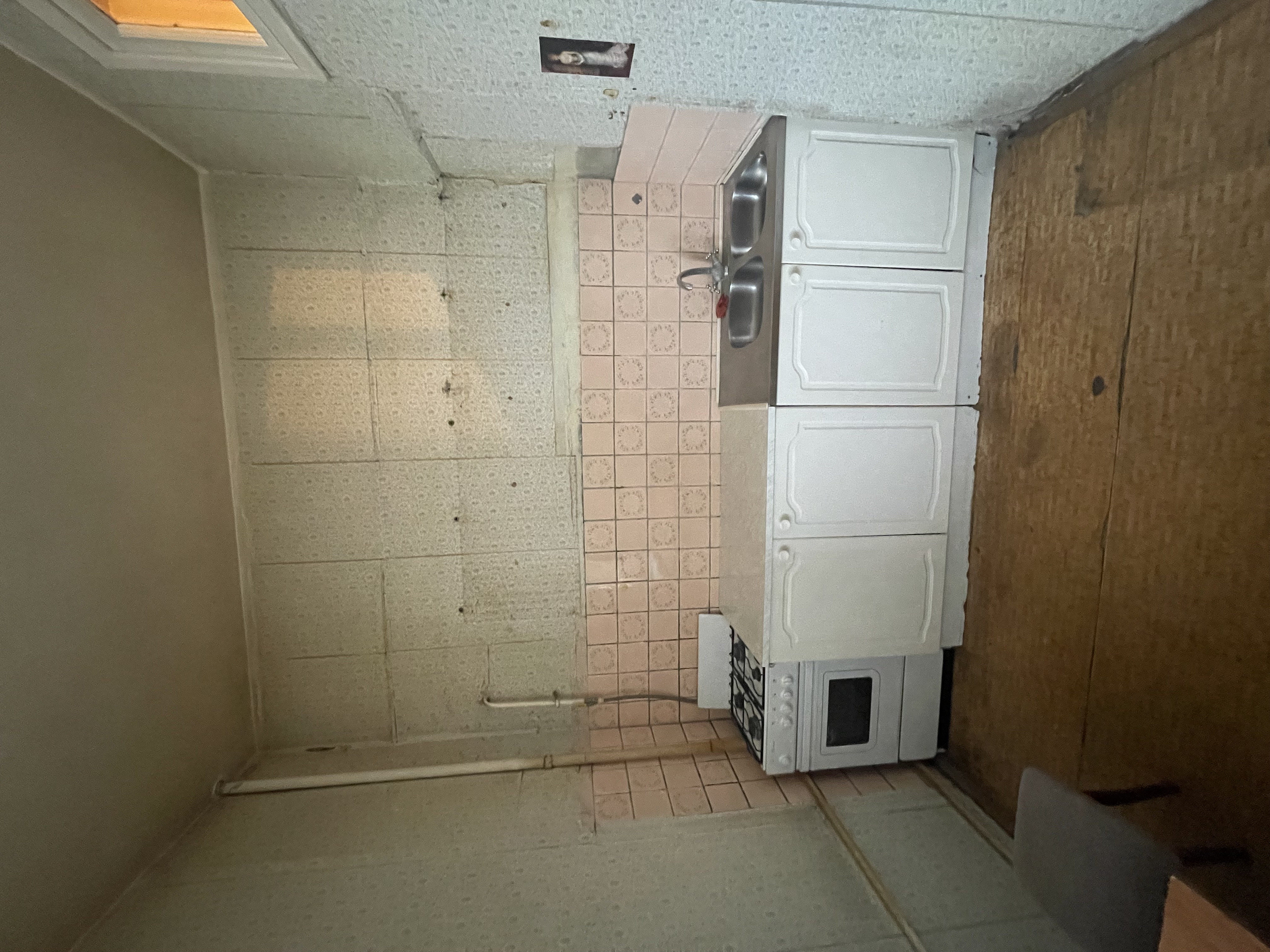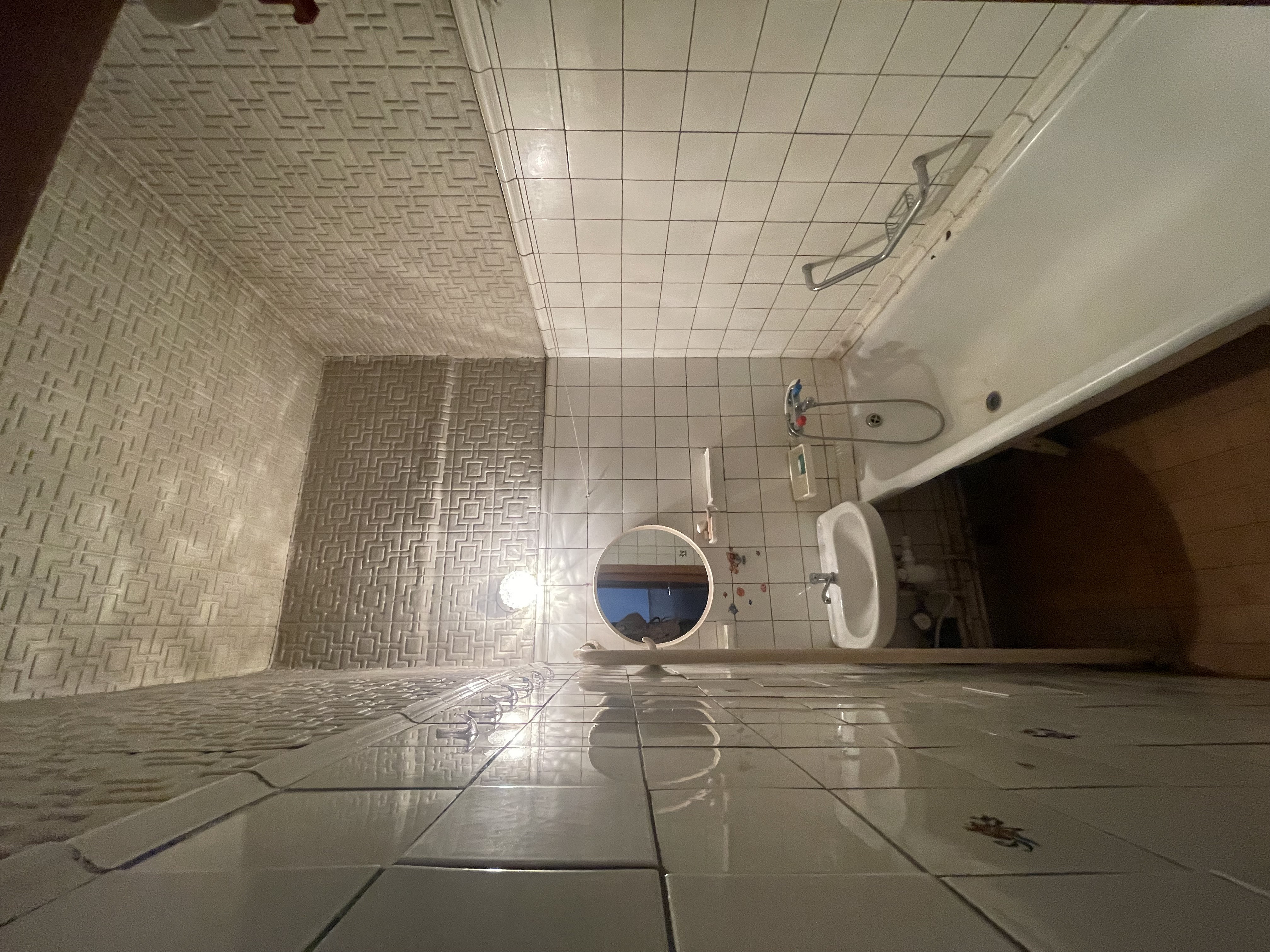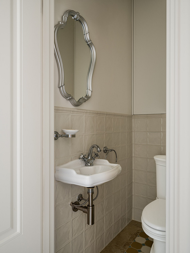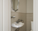В ванной комнате уместили только небольшую тумбу под раковину и шкафчик с зеркалом над раковиной.