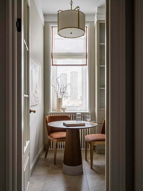Столовая группа состоит из стола в ореховом шпоне и пары стульев из дерева с обивкой терракотового цвета. Цвет обивки дублируется в канте на шторе.