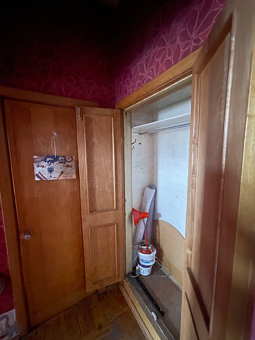 Хозяйственное хранение разместили в нише коридора, рядом с ванной комнатой. Раньше там была кладовка. Сейчас за шторой спрятаны стиральная машина, полки для хранения, а также утюг, гладильная доска и сушилка.