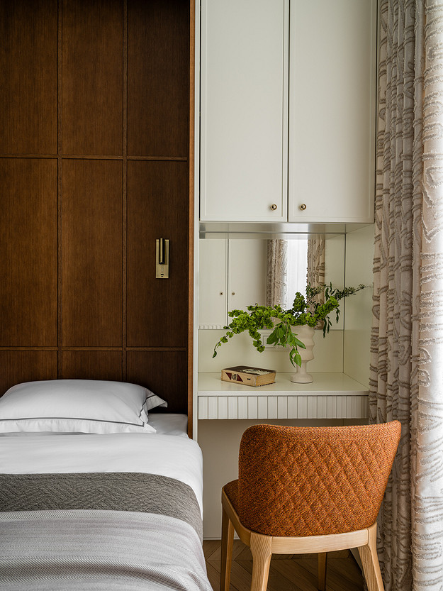 Вместо прикроватных тумбочек — ниша, которую предусмотрели внутри шкафа с одной стороны, а с другой — туалетный столик.