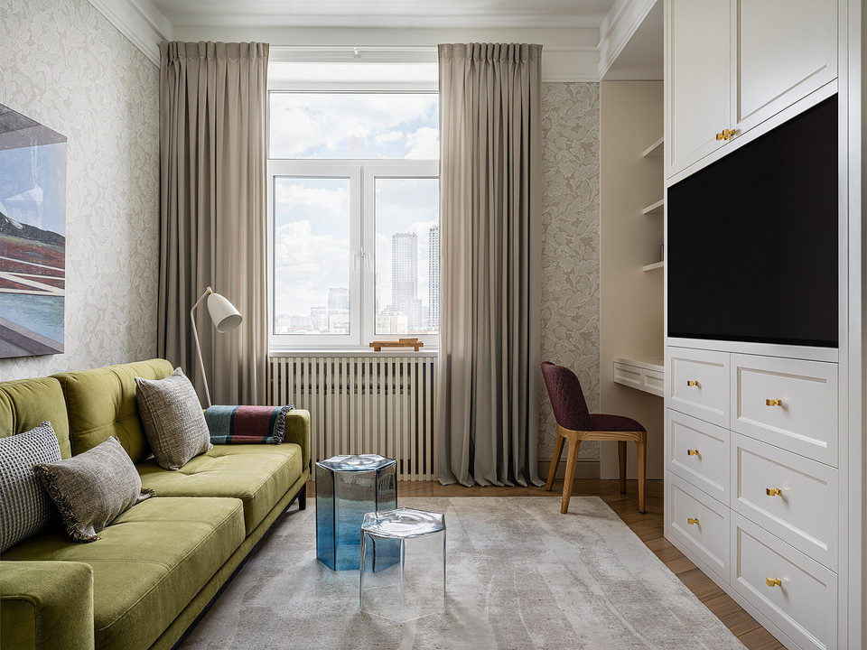 Владельцы этой квартиры обратились к архитектору Татьяне Казанцевой с запросом оформления интерьера в традиционном классическом стиле. Им хотелось сохранить дух сталинской архитектуры и привнести его в интерьер. В процессе ремонта семья была в ожидании пополнения. Для них было важно получить и все атрибуты современного комфорта: необходимая техника, вместительные системы хранения для большого количества вещей.