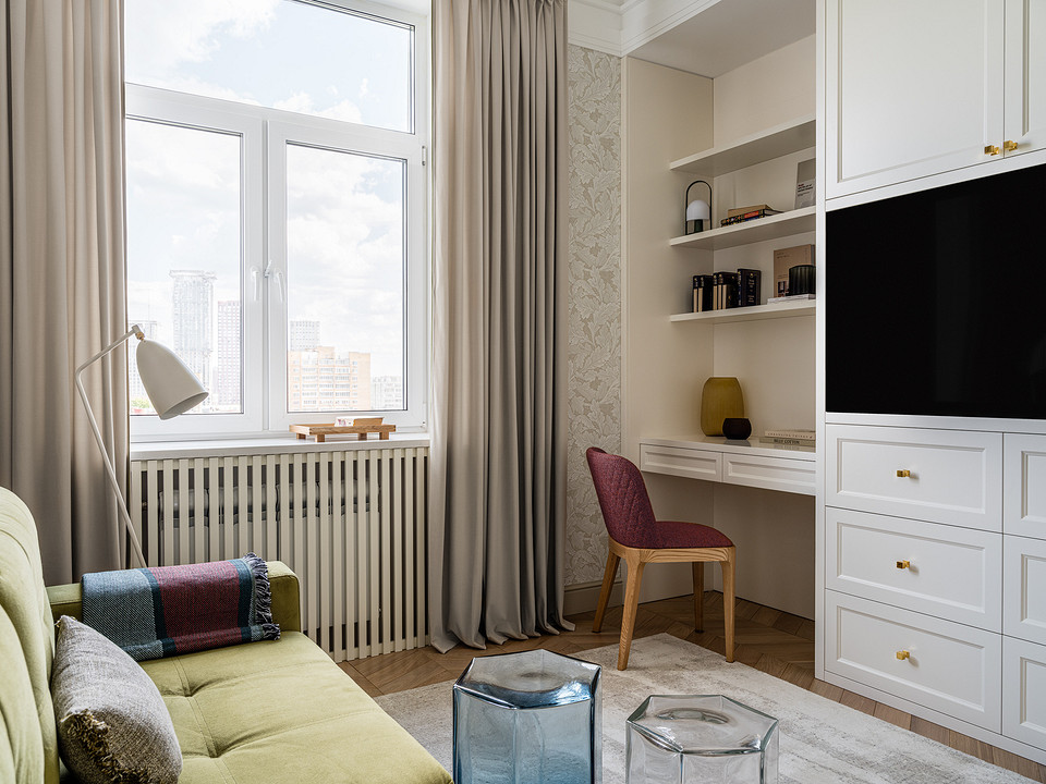 В гостиной шкаф тоже занял всю стену. Секции у входа предназначены для одежды, посередине — телевизор, выдвижные ящики внизу для детских игрушек, а также верхний шкаф. У окна разместили рабочее место с выдвижными ящиками и полками для книг.