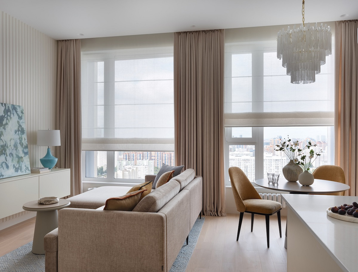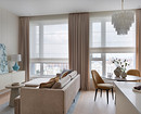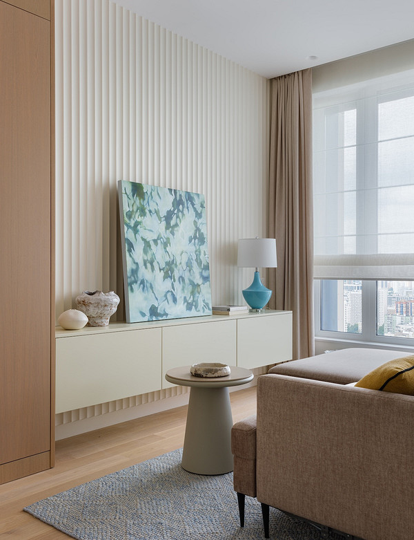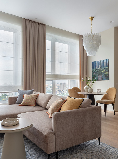 Владельцы этой квартиры — взрослая семейная пара. В течение года они много времени проводят на юге страны, и это вдохновило дизайнера Наталью Красавину на создание интерьера их московской квартиры — в основу легли «летние» оттенки: теплый белый, голубой, приглушенный желтый. «Основное пожелание — современный спокойный, элегантный интерьер в природной цветовой гамме. Заказчица была не против использования цвета, но предпочтение отдавала приглушенным деликатным оттенкам», — отмечает Наталья.