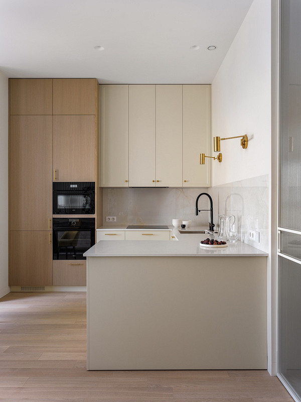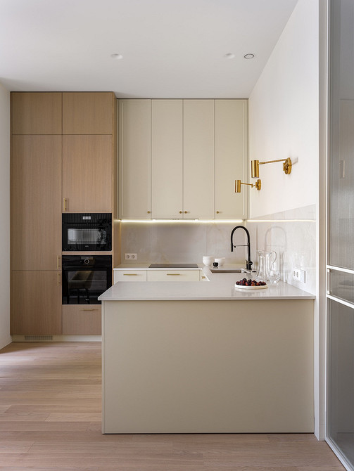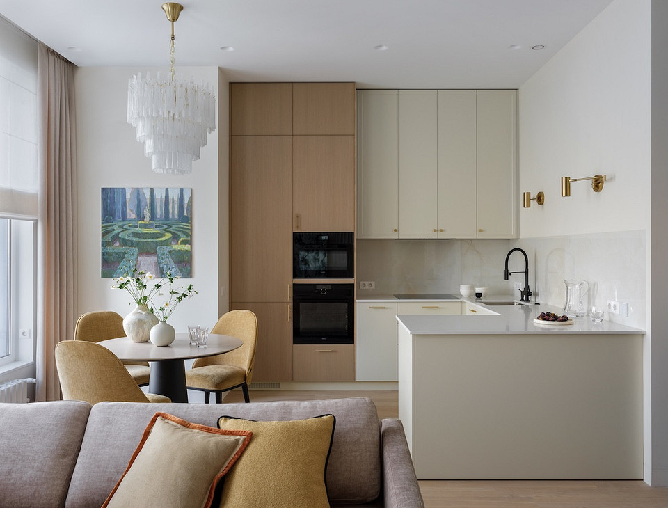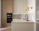 Хозяйка любит готовить, и ей хотелось иметь функциональную и продуманную кухню. Дизайнер предложила П-образную планировку гарнитура, но с верхними шкафами только по одной стене. Духовой шкаф, СВЧ и холодильник встроены в колонны. Рядом с мойкой — посудомоечная машина на 60 см. Для коллекции посуды хозяйки продумано закрытое хранение — по ее просьбе.