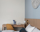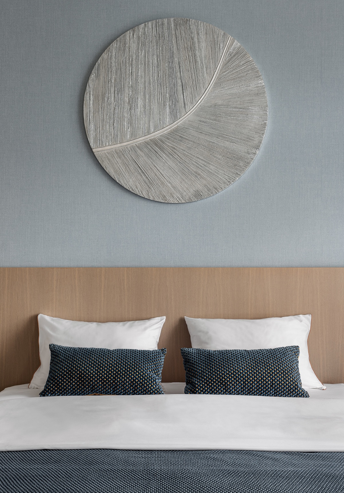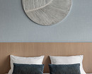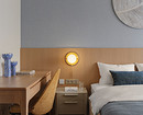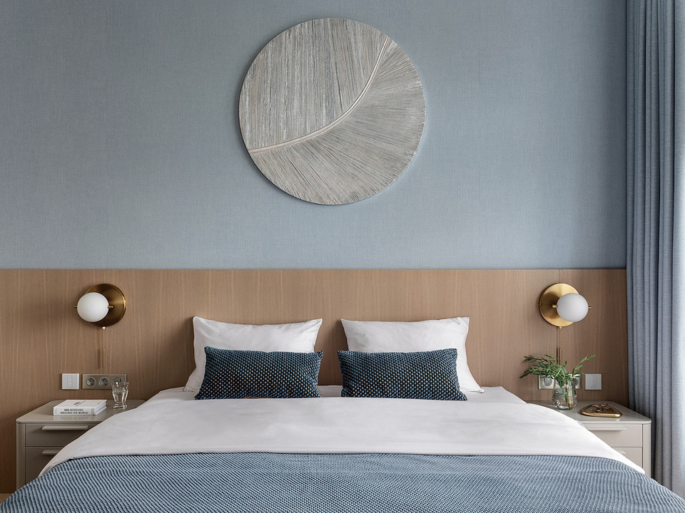 В спальне стену за изголовьем кровати украсили шпонированными панелями и фактурными обоями нежного голубого цвета.