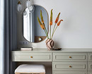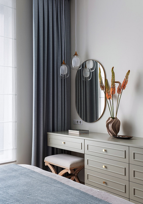 Диван выбирали раскладной — удалось найти элегантную модель в фактурной обивке бежевого цвета. Напротив дивана — консоль и полноценный шкаф. Рядом со шкафами предусмотрели розетки на случай, если хозяин захочет перенести свое рабочее место из спальни.