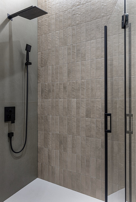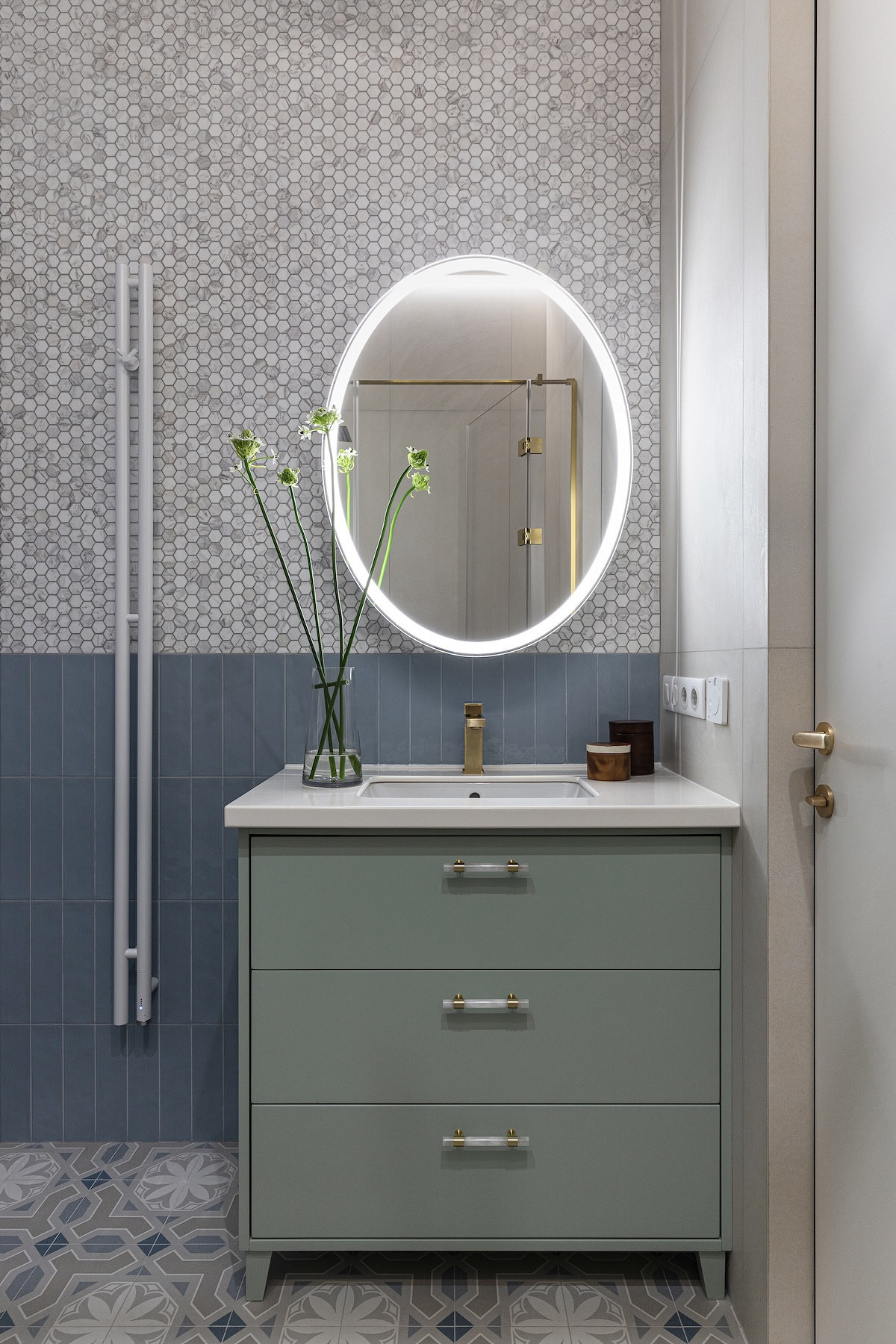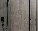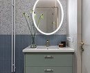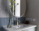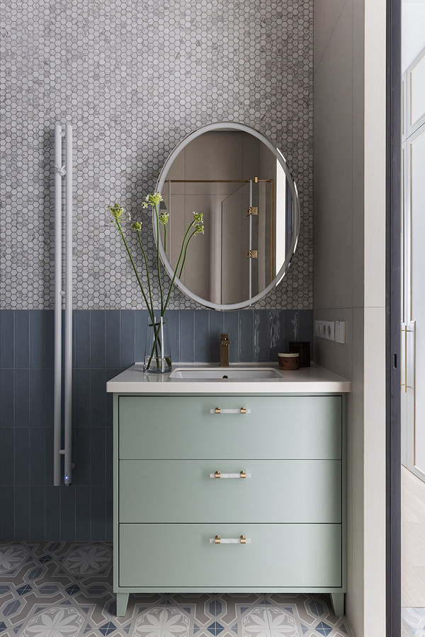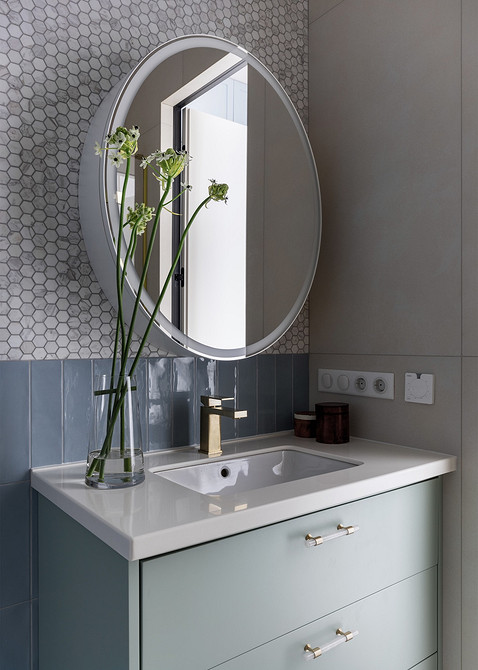 В санузлах скомбинированы разные виды плитки и керамогранита в приглушенных тонах. В основном санузле — крупноформатный бежевый керамогранит в душевой, голубая плитка и серо-голубая мозаика на стене напротив.