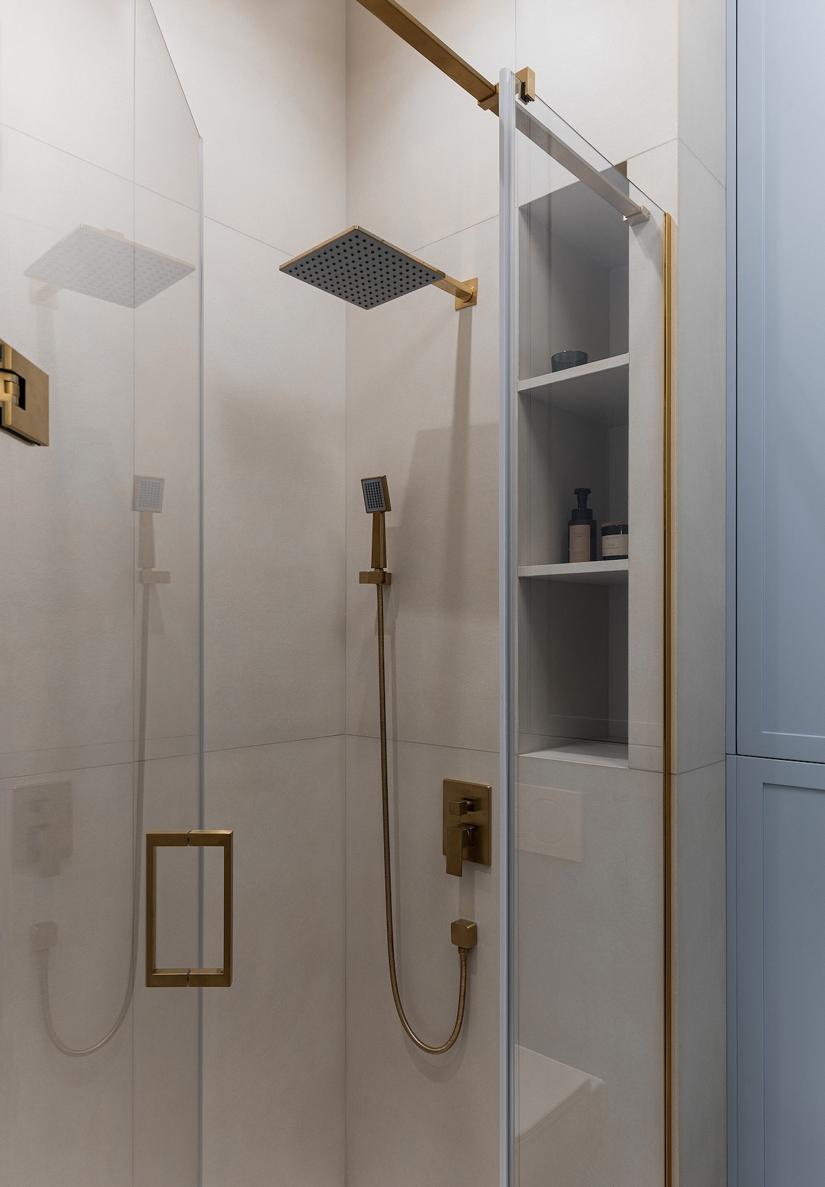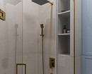 В основном санузле, кроме тумбы под раковину, зеркало с хранением (пожелание хозяйки), шкаф над инсталляцией и высокий шкаф рядом, сделанный в том же цвете единой конструкцией. В душевой — полки-ниши для средств.