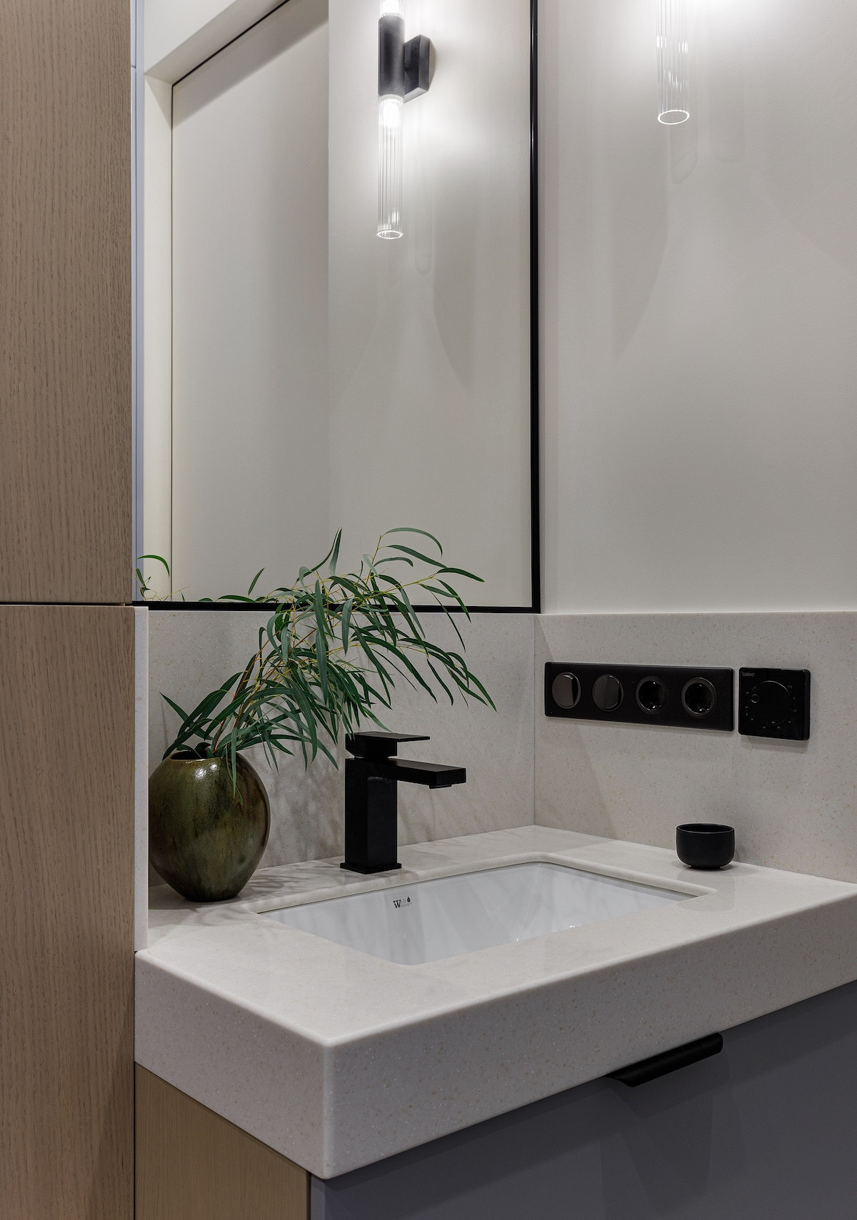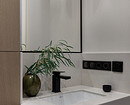 «Для того чтобы придать интерьеру глубину и тактильность, я использовала множество текстур и материалов. На полу уложена инженерная доска с шелковистым покрытием. Ритмичные стеновые панели в прихожей перекликаются с отделкой ТВ-зоны в гостиной. Стена за изголовьем кровати в спальне отделана шпонированной панелью и текстильными обоями. Верхнюю часть стены украшает текстурное гипсовое панно, выполненное на заказ. Все это создает расслабляющую атмосферу в спальне. В санузлах применено сочетание крупноформатной и мелкоформатной плитки и мозаики. В итоге в интерьер получился очень тактильным, обволакивающим и уютным», — комментирует Наталья.