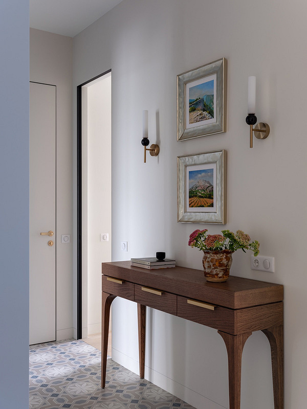 Системы хранения выполнили на заказ — они поддерживают концепцию функционального и уютного интерьера. В прихожей — вместительный шкаф для одежды и обуви, в котором спрятан еще и щиток. По просьбе хозяев предусмотрели банкетку и место для обуви под ней — под плиткой уложен теплый пол, поэтому предполагается, что обувь там быстро высохнет. На реечные панели повесили крючки для повседневной верхней одежды. Консоль напротив шкафа — для ключей, других мелочей, а еще это место для красивого декора.