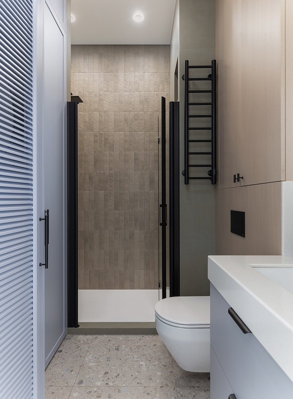 В санузле-постирочной — керамогранит под терраццо на полу, мелкоформатная бежевая плитка и крупноформатный серый керамогранит в душевой. Объемные шкафы в обоих помещениях выполнили в голубом цвете.