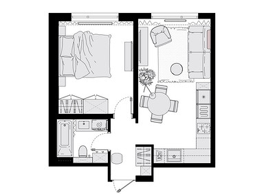 Изначальную планировку не меняли. Это классическая современная однушка в новостройке: кухня-гостиная, отдельная спальня, ванная комната. Застройщик также предусмотрел нишу в прихожей для встройки шкафа.
