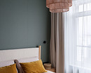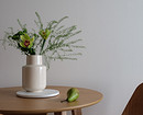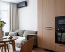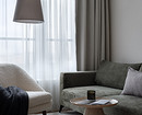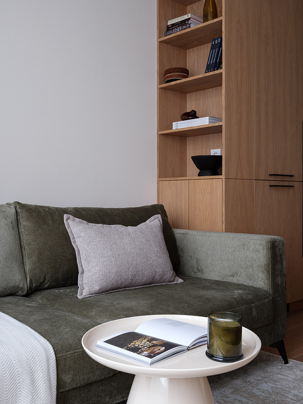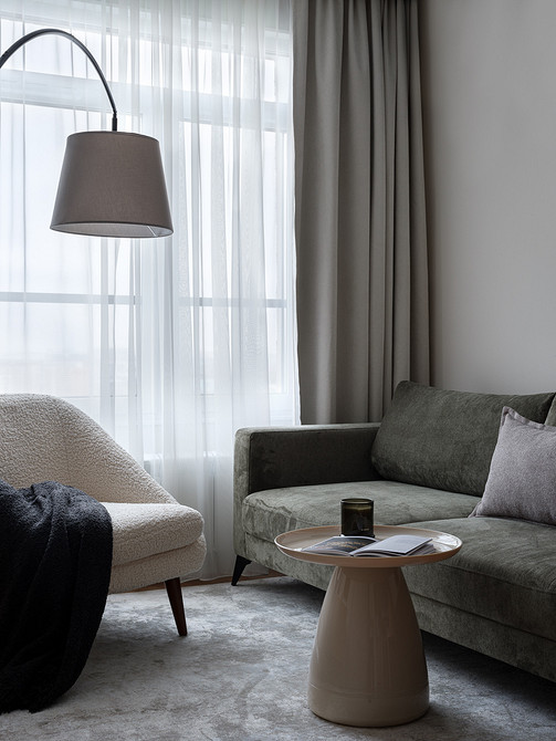 В собственно гостиной — диван в обивке приглушенного зеленого цвета, деревянная тумба под телевизор и кресло в обивке из ткани букле белого цвета. Также для диванной группы подобрали журнальный столик в светлом оттенке с глянцевым финишем.