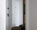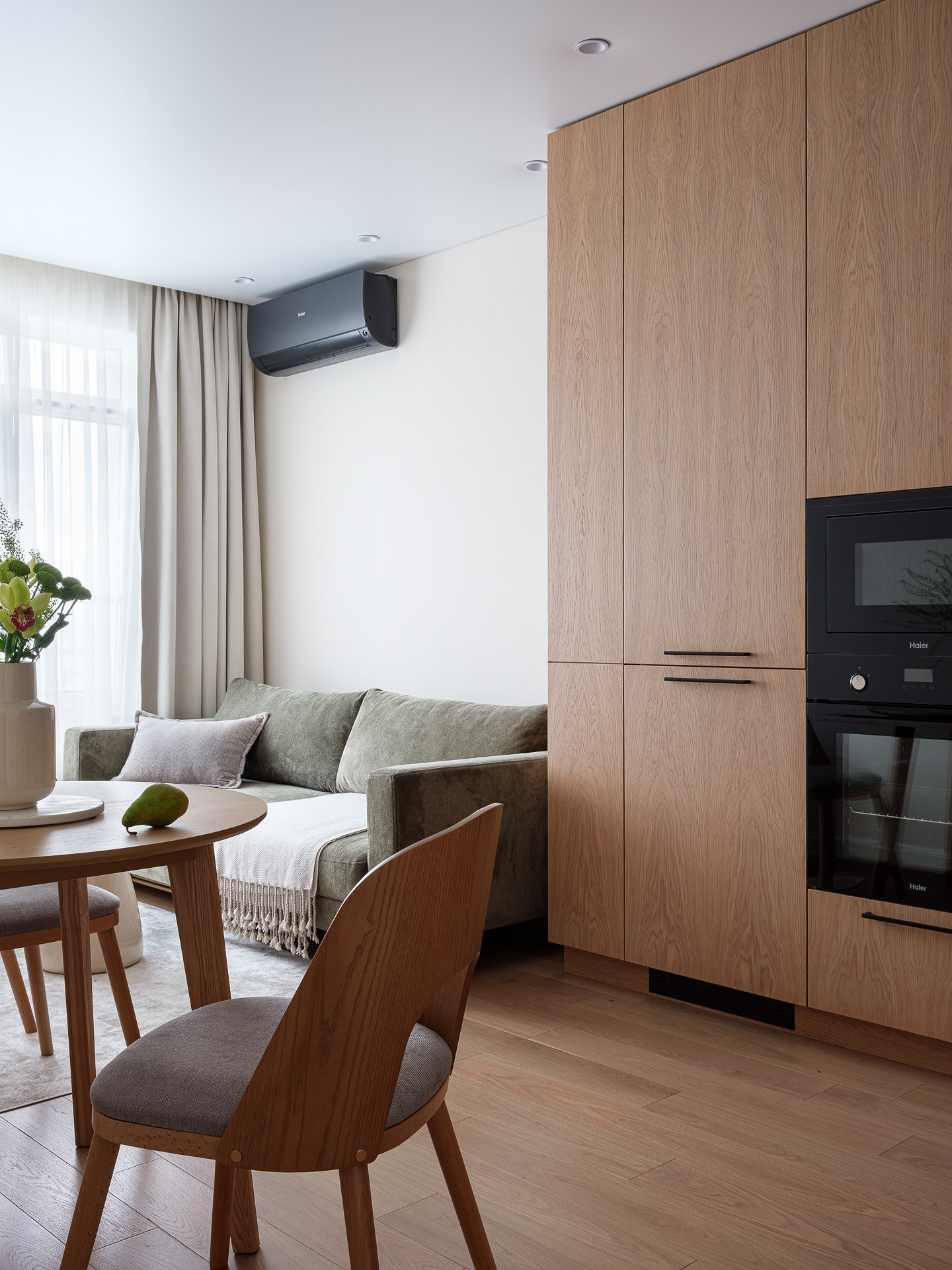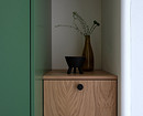 В прихожей встроили в шкаф в нишу, предназначенную для этого застройщиком. При входе — секция с подвесной тумбой, под которой есть розетка для робота-пылесоса, и верхним шкафом. Эта секция выполнена из шпона дерева. Собственно же шкаф — в зеленом цвете, что добавляет яркости и акцента в нейтральной прихожей.