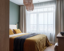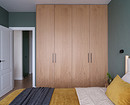 В спальне установлен высокий шкаф для повседневной одежды, он тоже выполнен в шпоне. Одна из секций прячет гладильную доску и утюг.