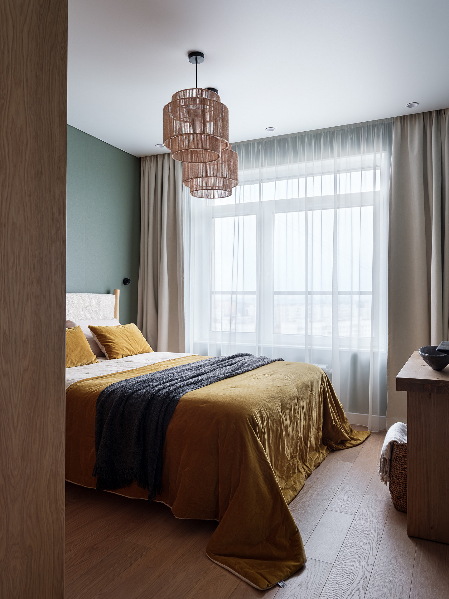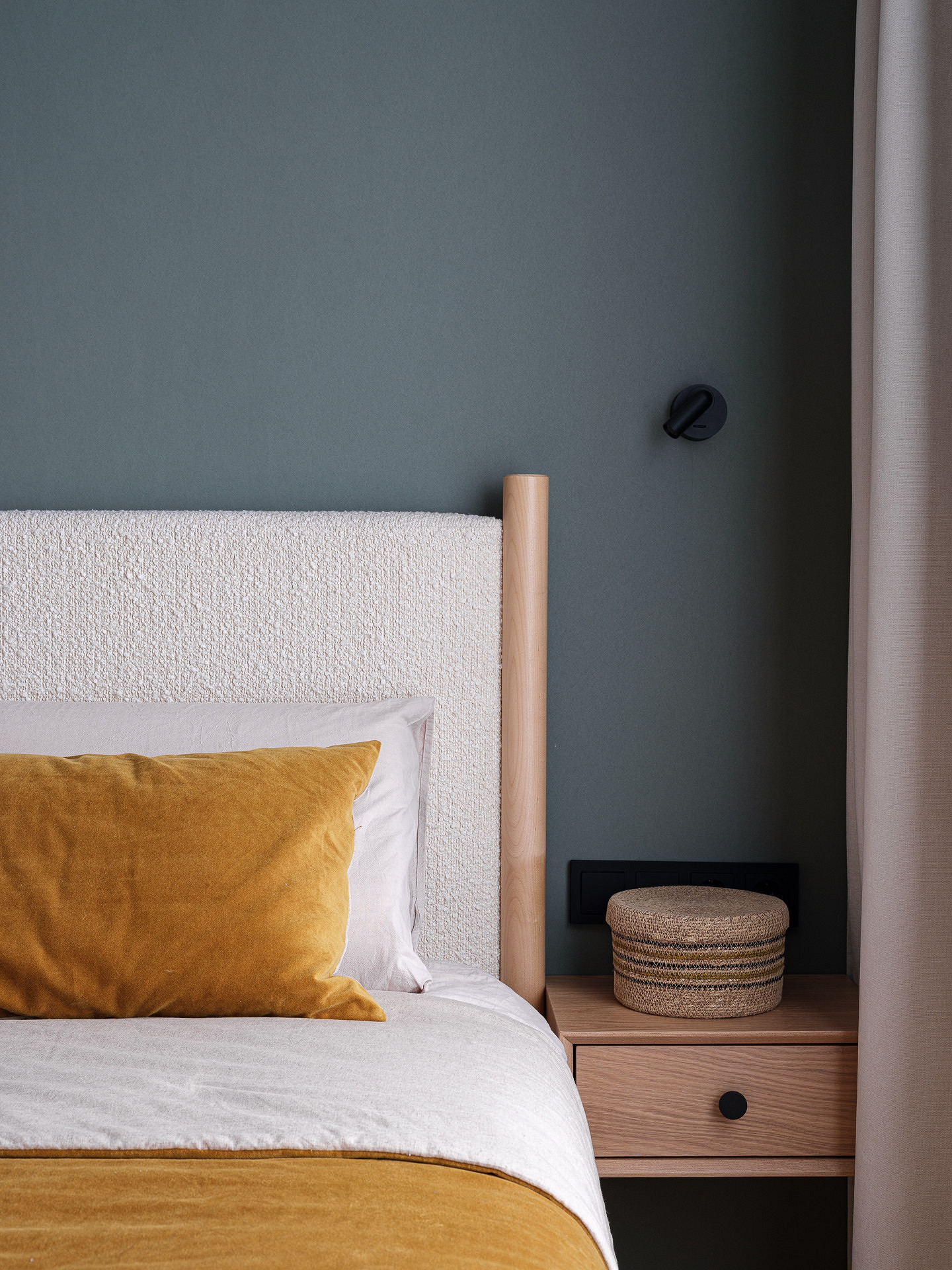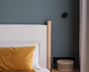 Кровать — с деревянным каркасом и изголовьем, обитым светлой тканью-букле. Тумбочки выполнены из дерева, как и массивная консоль напротив кровати.