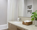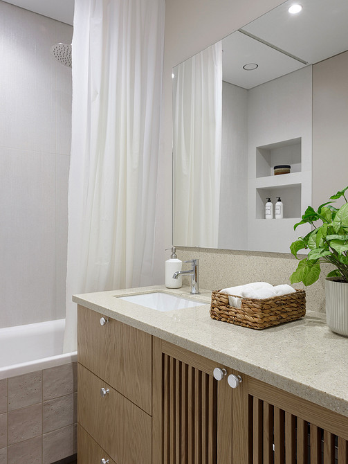 В ванной комнате — вместительная тумба под раковину, под раковиной также поставили стиральную машину, сделали фасады с перфорацией для естественной вентиляции. Кроме этого, рядом с унитазом разместили шкафчик для хозяйственного хранения, а над ним сделали доступ к коммуникациям.