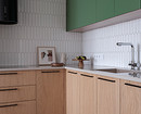 Кухонный гарнитур выполнен в том же ключе: зеленый цвет и дерево. Выбрали угловую планировку. Нижние шкафы и колонны с техникой отделаны шпоном, верхний ряд шкафов — с зелеными фасадами. Вся необходимая техника встроена.