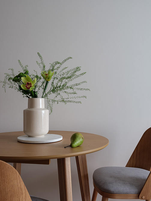 Анна выбрала натуральные материалы и природные цвета для отделки. На стенах в прихожей и кухне-гостиной — светлая краска. В спальне создана более камерная атмосфера — выбрали обои глубокого зеленого цвета. На пол уложили инженерную доску.