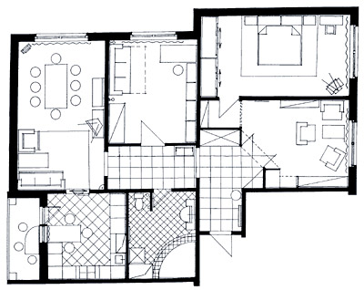 Что же можно сделать из бывшей четырехкомнатной квартиры для семьи из трех человек? Итак, по порядку. Небольшая прихожая визуально увеличена зеркальными плоскостями шкафа-купе. Одновременно расширили вход в гостиную, которая функционально отделена от столовой и имеет все, что нужно для отдыха