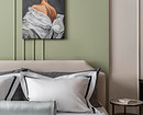 Для спальни автору хотелось использовать более мягкую цветовую гамму, поэтому на карнизах место бургунди занял коралловый, а на стене появился оттенок спелого авокадо в качестве акцентного решения. Неоклассику поддерживают латунные элементы и симметричная раскладка молдингов.