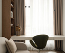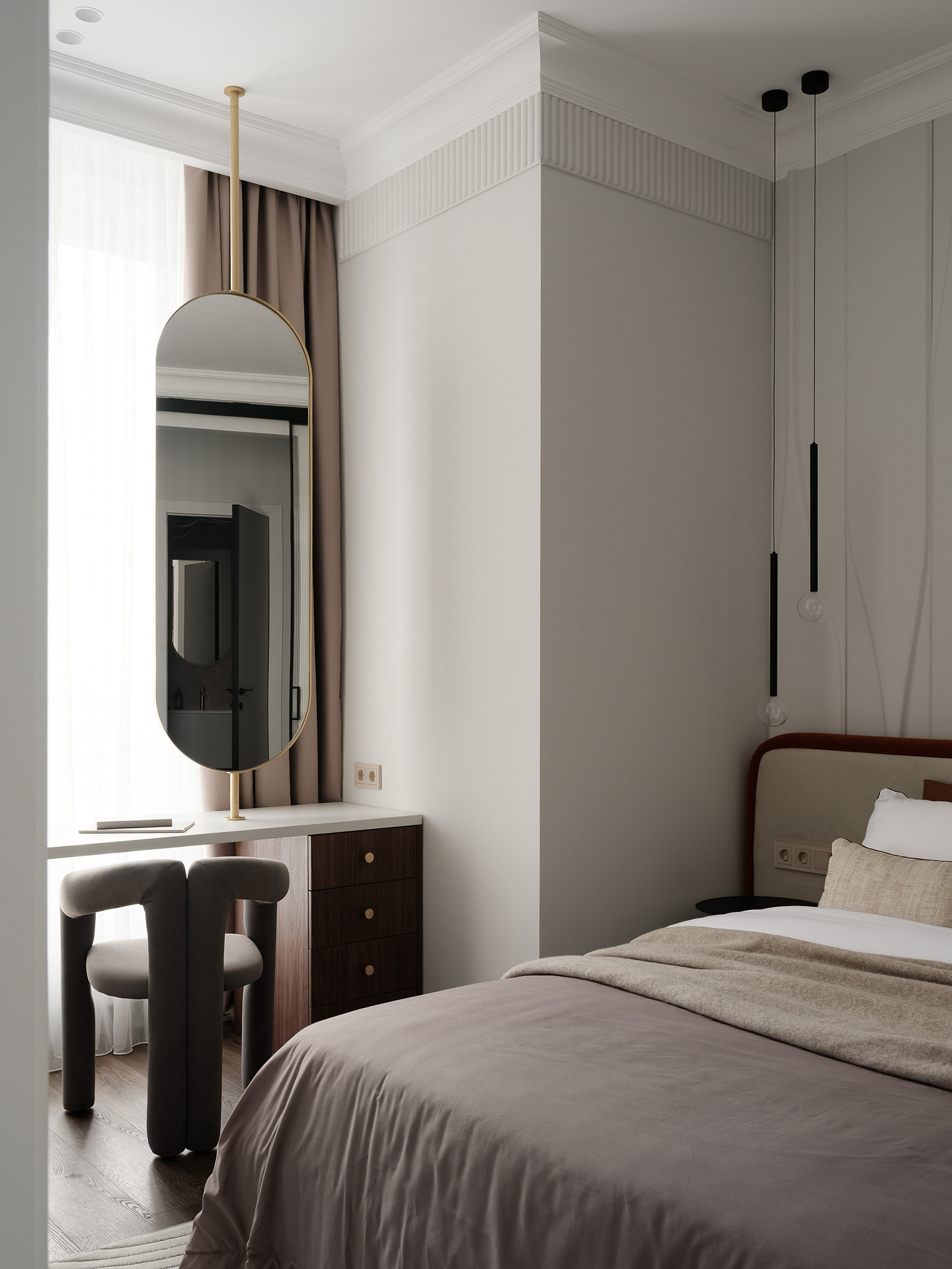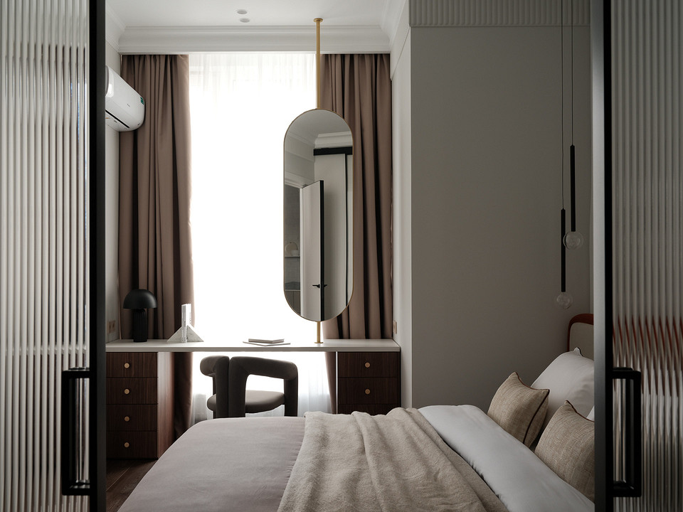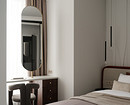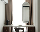 В спальне, кроме большой кровати, сделали консольный столик у окна. Предполагается, что у него двойное назначение: и туалетный столик, и рабочий стол. Поэтому на столешнице разместили зеркало на штанге. А для хранения предусмотрели выдвижные ящики под столом.