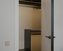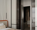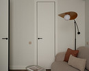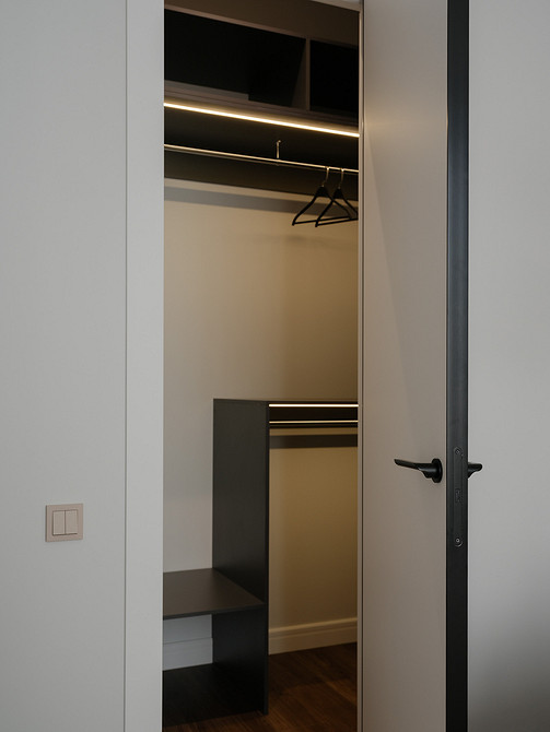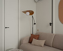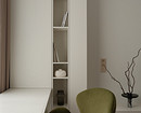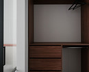 Дизайнер предусмотрела две гардеробные: одну — в кабинете, вторую — в спальне. Это позволило отказаться от больших шкафов для одежды. Однако в кабинете предусмотрели системы хранения для книг и бумаг: стеллаж с открытыми полками и шкаф. Они установлены по бокам от окна и консольного рабочего стола с выдвижными ящиками. Кроме этого, есть тумба-консоль под телевизор как дополнительное место хранения.