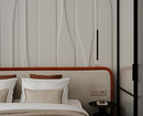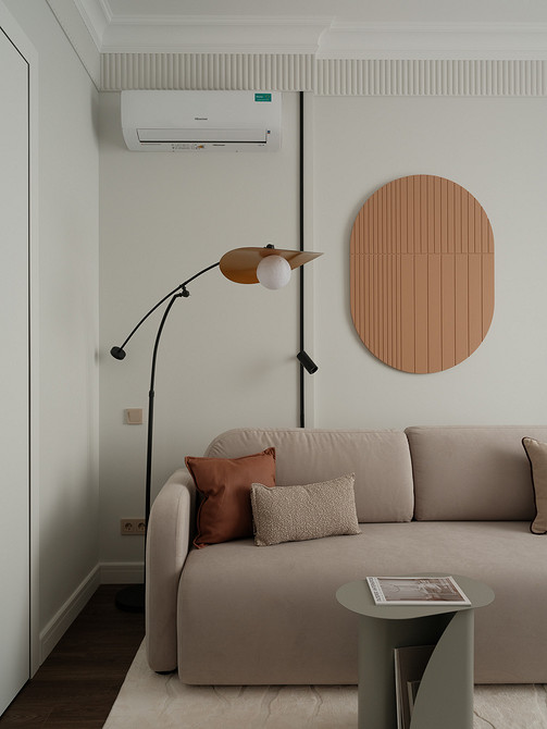 Для стен использовали светлую краску. Добавили акцентов с помощью объемов и фактур. Так, использовали лепной декор: высокие потолочные карнизы и рифленые панели под потолком, гипсовый барельеф в спальне на стене за изголовьем кровати. Скругленные перегородки в кухне-гостиной и прихожей добавили пространству мягкости и изящества.