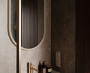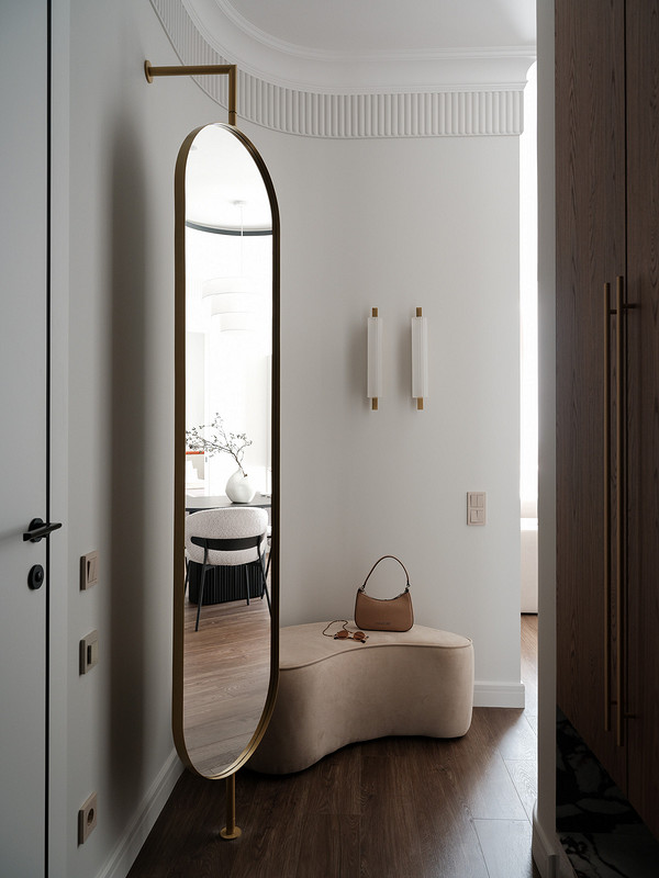 В прихожей предусмотрели шкаф для верхней одежды с подиумом из керамогранита. «Это отличное решение, чтобы спрятать обувь с глаз. Рядом также расположились вместительные выдвижные ящики для мелочей», — отмечает Евгения. Для прихожей подобрали необычное зеркало на штанге, которое можно поворачивать в нужную сторону. А также пуф, подчеркивающий своей формой изогнутую стену.