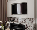 В гостиной — мягкий диван. Вместо тумбы под телевизор — камин. Полка камина может служить местом для хранения при необходимости.