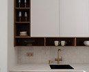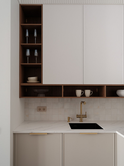 Кухню сделали П-образной с рядом шкафов-колонн, куда встроили холодильник, духовой шкаф и СВЧ, а также предусмотрели места для хранения. Ниша там же поможет хранить мелкую бытовую технику, не заставляя ей столешницу. В торце перегородки, отделяющей кухню от прихожей, встроили шкаф-витрину для красивой посуды.