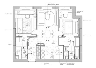 Изначально в квартире не было перегородок, но определены «мокрые» зоны санузлов и кухни. Предполагалось, что это двушка. Дизайнер предложила перепланировку. Вместо кухни сделали дополнительную комнату (сейчас кабинет-гостевая, в будущем, возможно, детская), кухню перенесли в коридор, она объединена с гостиной. В каждой комнате выделили гардеробную. В спальне через гардеробную сделали вход в ванную комнату. Второй санузел — в общем доступе из прихожей. Таким образом, планировкой «закрыли» основные задачи, поставленные перед дизайнером.
