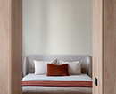 В спальне акцентным стал рабочий стол, выполненный с выдвижными ящиками терракотового цвета, а также рабочее кресло. Текстиль для кровати (дорожку, декоративные подушки) тоже подобрали в этой гамме.