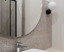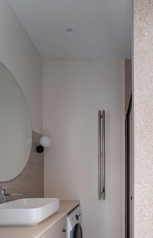 На полу в прихожей и на кухне уложен одинаковый керамогранит, а в гостиной и спальне — ламинат. В ванной комнате использовали один керамогранит под терраццо для пола, стен в душевой и над раковиной. Поверхности, с которыми не будет соприкасаться вода, покрасили в светлый цвет.