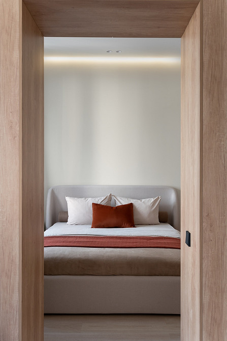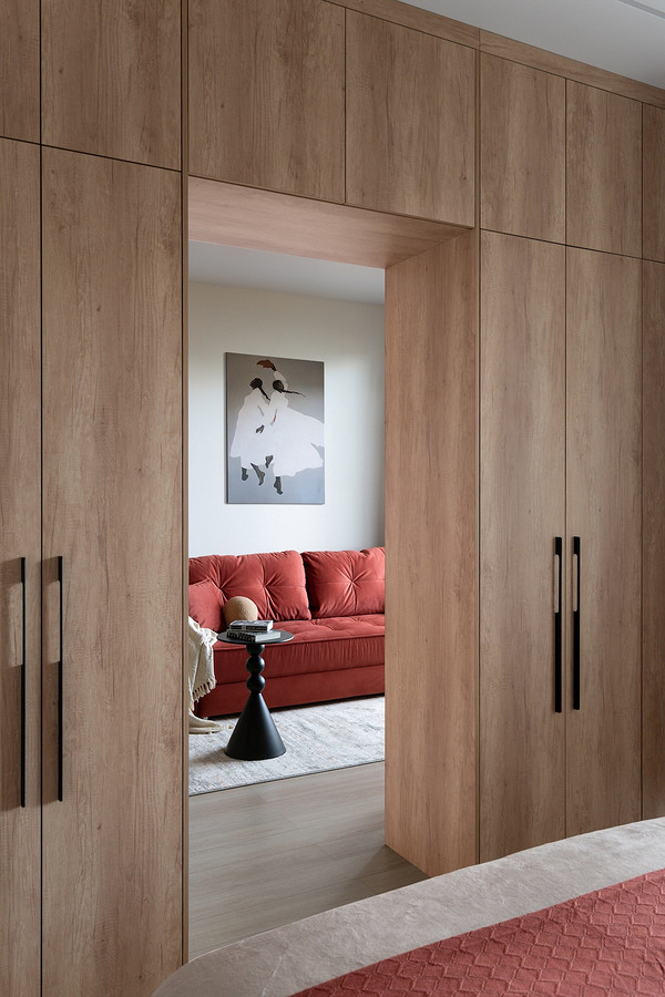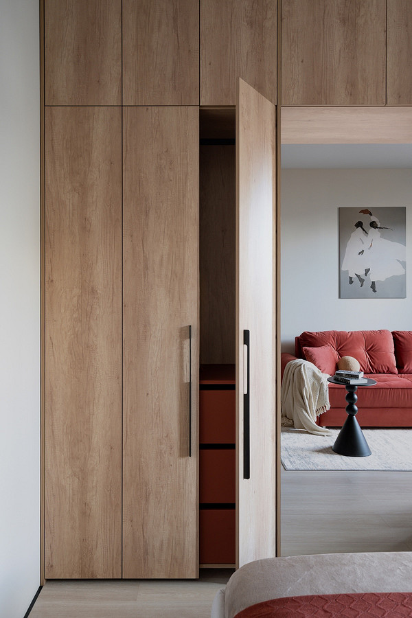 В итоге со стороны спальни это полноценные системы хранения (одна из фишек — фасады и корпуса сделаны из ЛДСП под дерево, а наполнение — из терракотового ЛДСП, под цвет ярких акцентов), а со стороны кухни-гостиной — деревянные панели.