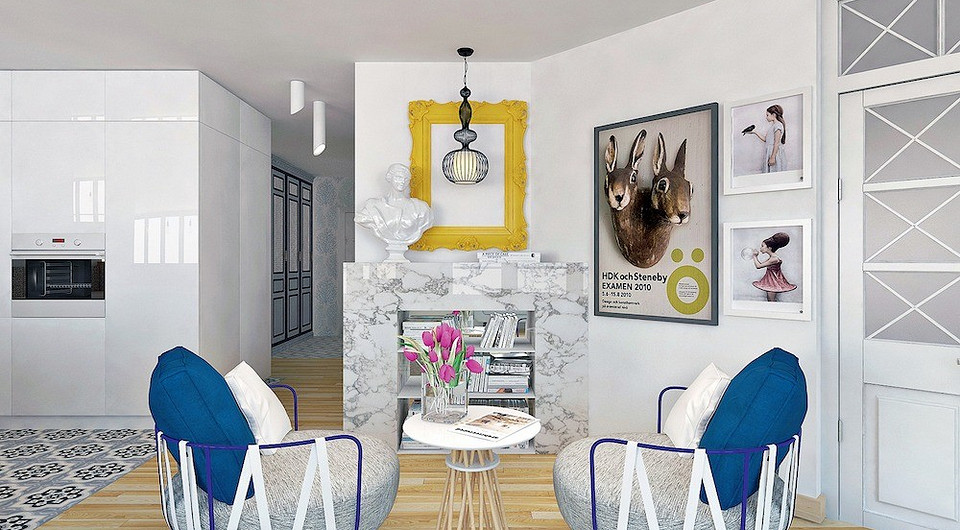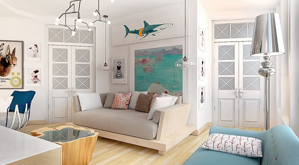 Зону гостиной выделяет колонна, органично вписанная в планировку. На колонну крепится телевизор, под ним расположена выполненная на заказ тумба, внутри которой находится радиатор отопления; для рециркуляции воздуха в конструкции предусмотрены прорези. Благодаря выходящим в гостиную двустворчатым дверям детской пространство становится воздушным.