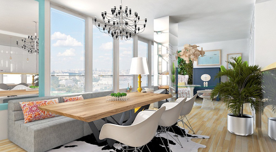 Все функциональные зоны визуально связаны между собой, поэтому из любой из них удобно будет общаться с находящимися в кухне или столовой.