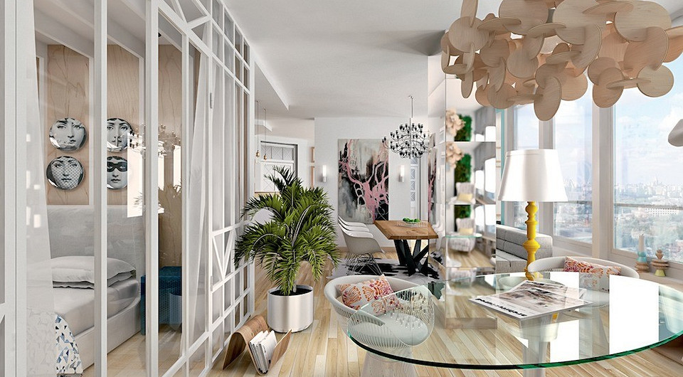 Особенностью квартиры станет галерея с анфиладой вдоль окон лоджии. В целях теплосбережения изнутри лоджий будет установлен дополнительный ряд окон со стеклопакетами. В углу детской, рядом с окном, где находится решётка для проветривания, выделяется техническое помещение для системы кондиционирования. Спальня хозяйки организуется в удалении от окна, её продолжением станет мастерская. Спальное место отделяется столярной перегородкой со стеклом и полупрозрачным тюлем. Комната дочери будет состоять из двух частей: спальной зоны, оформленной в виде уютного домика, и игровой.