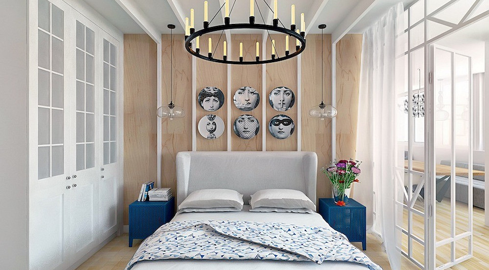 Комната соседствует с санузлом, вход в который решили не выделять, а оформить в том же ключе, что и белые двери шкафа, протянувшегося вдоль всей стены спальни.