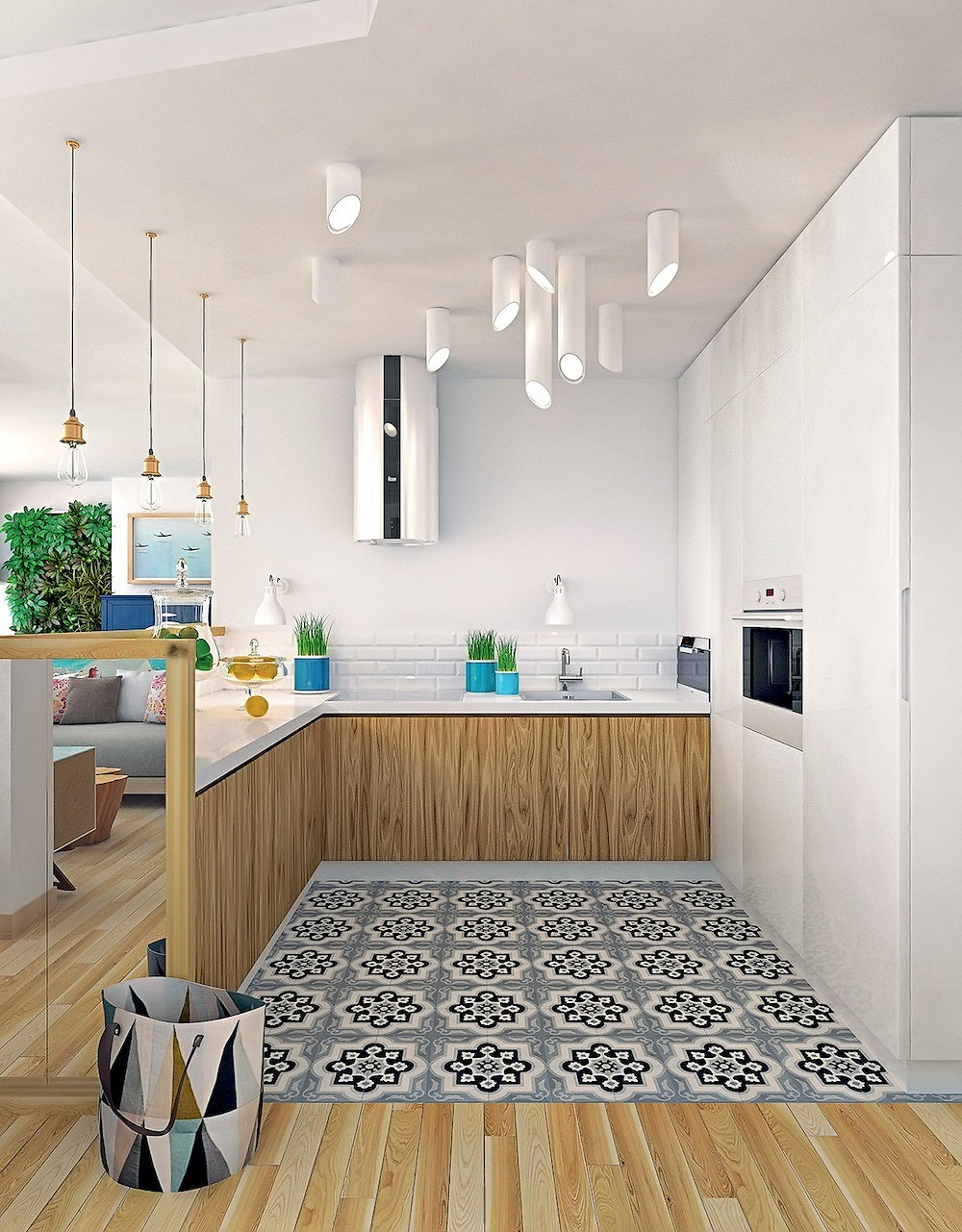 Зона готовки выделена за счёт понижения потолка и модульной линейки, которая служит фартуком; облицованная зеркалами торцевая стенка теряется в пространстве. Благодаря ей со стороны столовой не просматривается кухонная утварь.