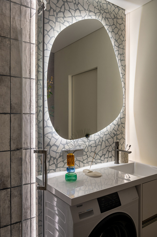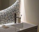 «Этот материал был выбран за его прочность, легкость в уходе и способность скрывать загрязнения. Фактура терраццо добавила интерьеру живости и динамики», — комментируют Анастасия и Виктория. Для пола остальной площади квартиры выбрали ламинат высокого класса. Потолок сделали натяжной — выбор также обусловлен практичностью и скоростью монтажа.