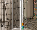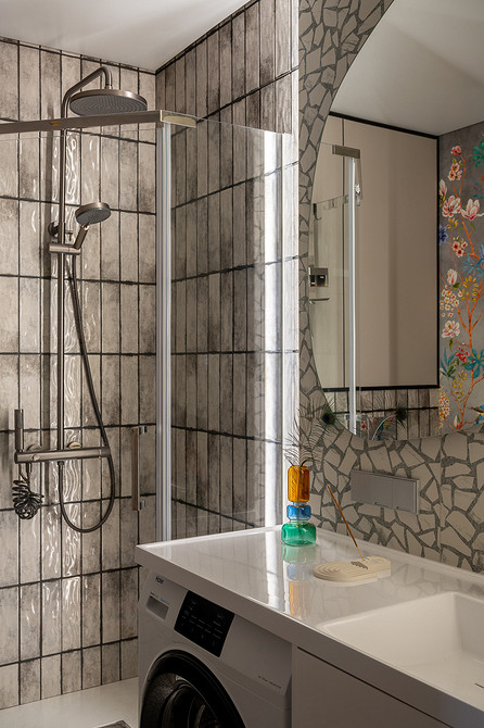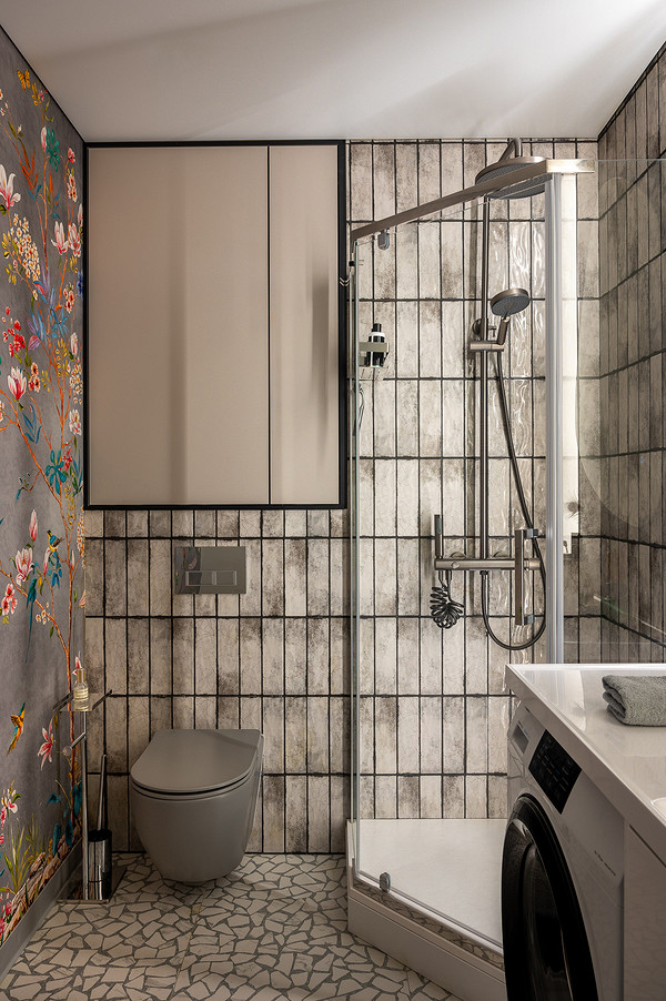 Такую же плитку выбрали для пола и стены за раковиной в санузле. Стены душевой и инсталляцию унитаза оформили прямоугольной мелкоформатной плиткой. А для стены, куда не попадает вода, выбрали шелковую фреску.