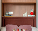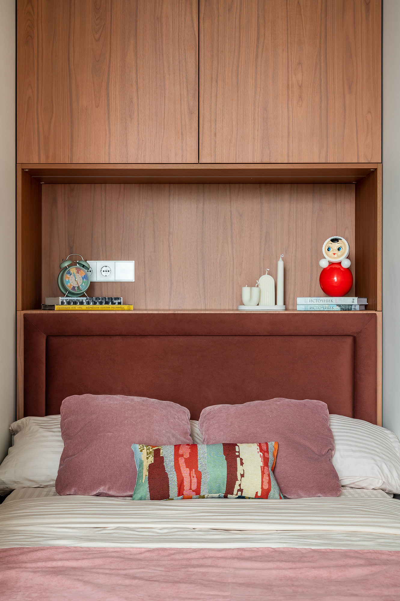 Кровать вписали в нишу, размер спального места — 1 200 см, выбрали модель с подъемным механизмом для дополнительного хранения. За кроватью расположен шкаф для хранения текстиля, над изголовьем предусмотрели открытую полку, которая может заменить прикроватную тумбочку.